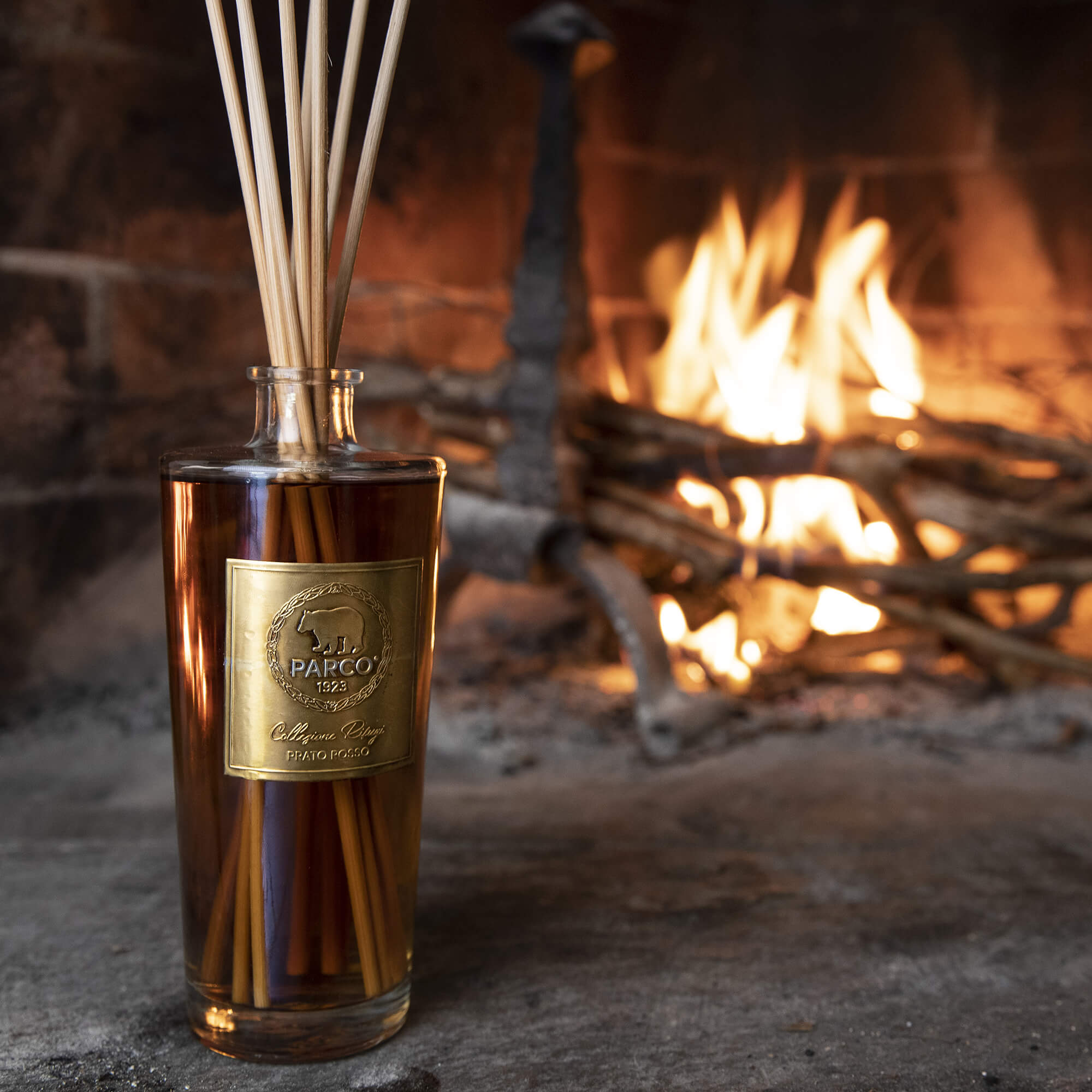 Il camino acceso diffonde una lieve scia di brace, evocata da una sottile nota fumé.